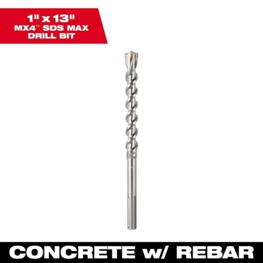 The MILWAUKEE 1″ X 8″ X 13″ MX4 4-Cutter SDS MAX Rotary Hammer Drill Bits with solid head carbide deliver up to 5x longer life in concrete with rebar. Engineered with rebar guards to provide maximum durability in hard aggregate and rebar. MIlwaukee designed their MX4 4-Cutter bits with sharp centering tips for exact spot drilling in concrete. The integrated 4-cutter design prevents lock-up in rebar, reducing downtime. Optimized flutes remove dust faster, reducing heat and delivering up to 15% more holes per battery charge. The wear mark indicator on each drill bit shows you when they no longer meet the ANSI requirement. These MILWAUKEE MX4 4-Cutter Drill Bits are ideal for concrete with rebar and masonry applications.