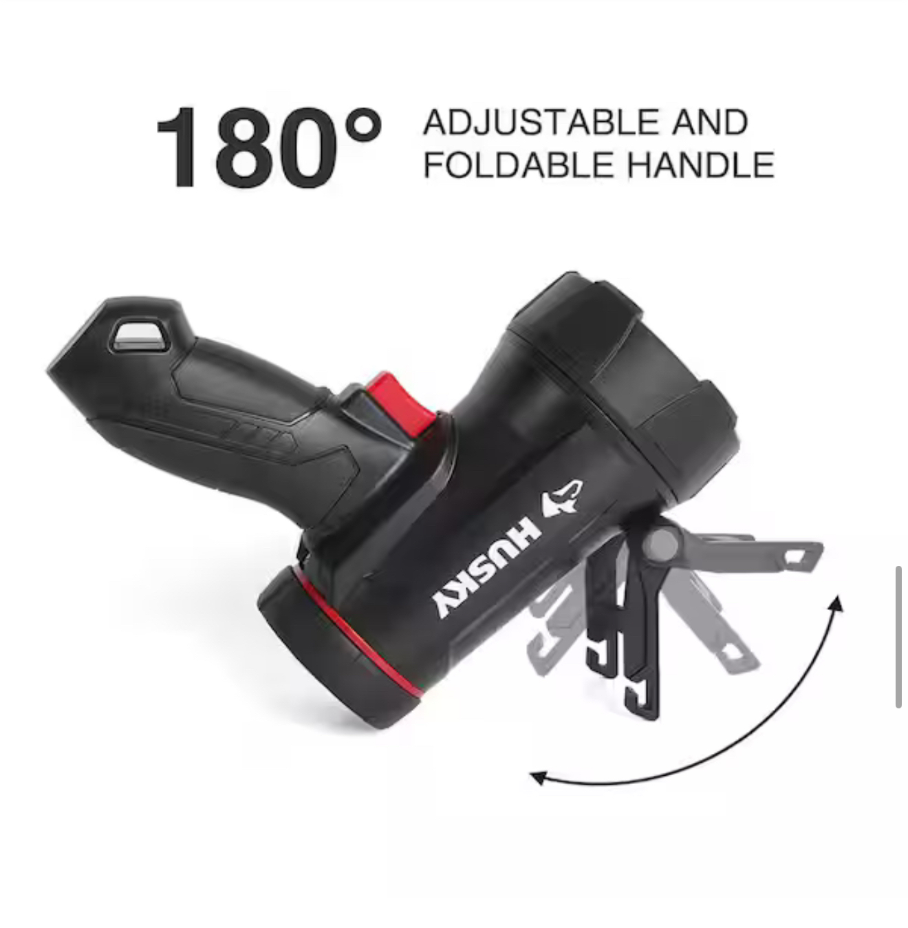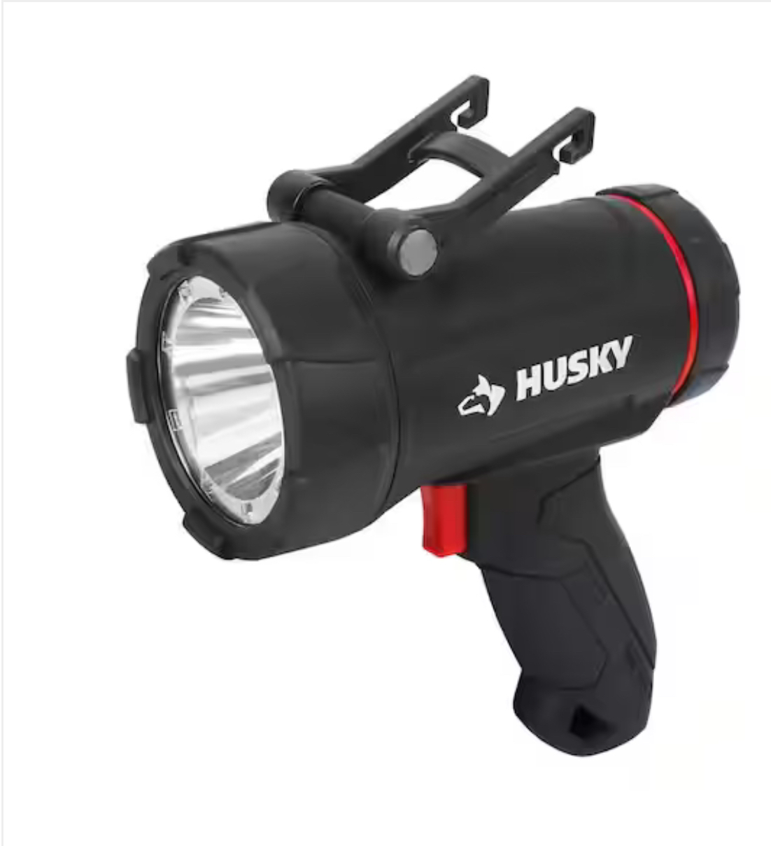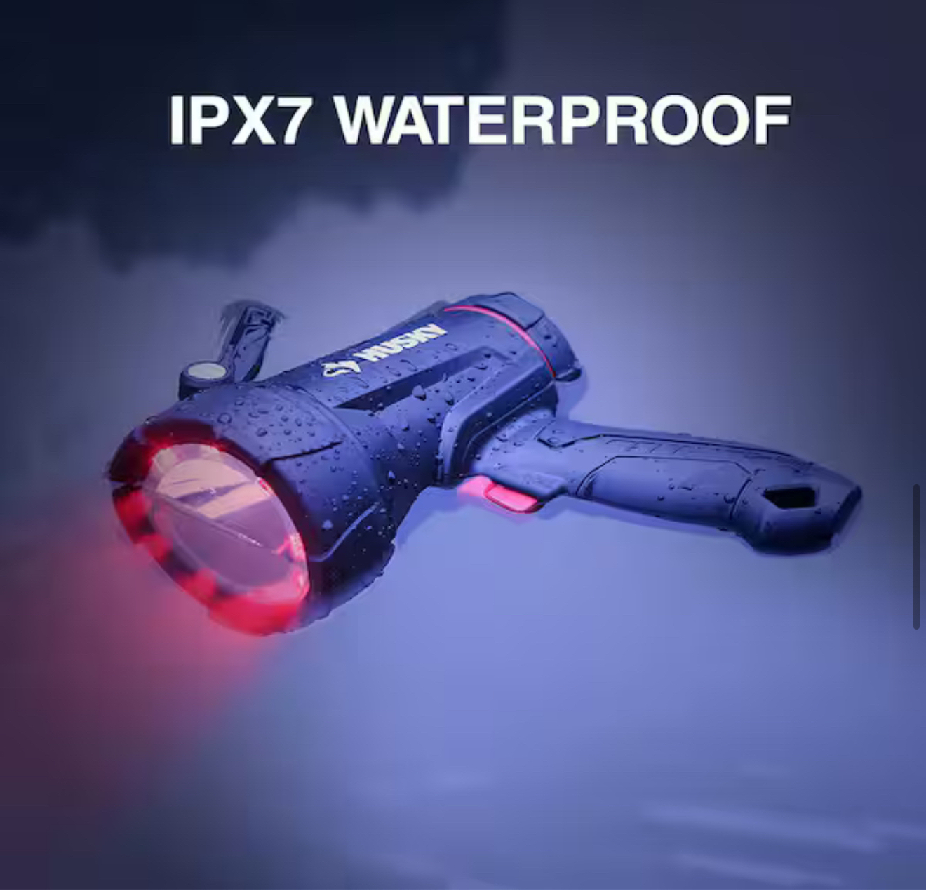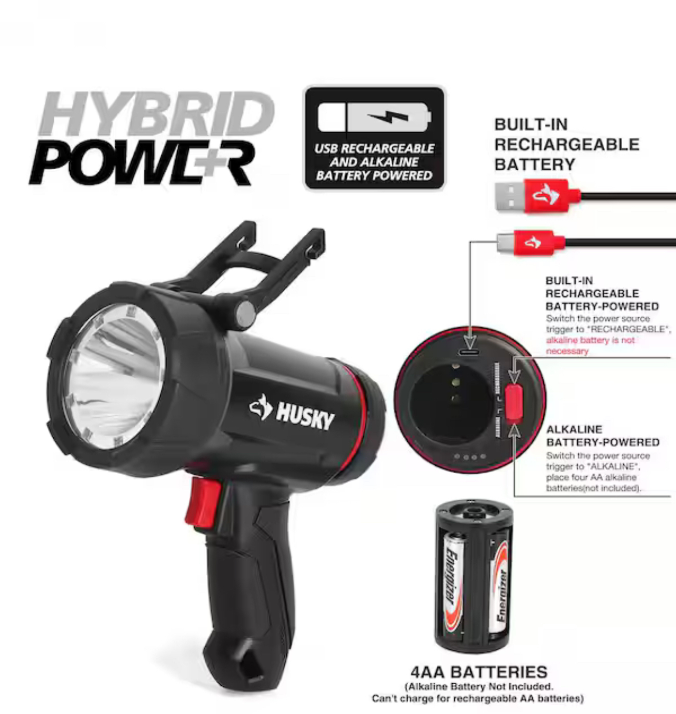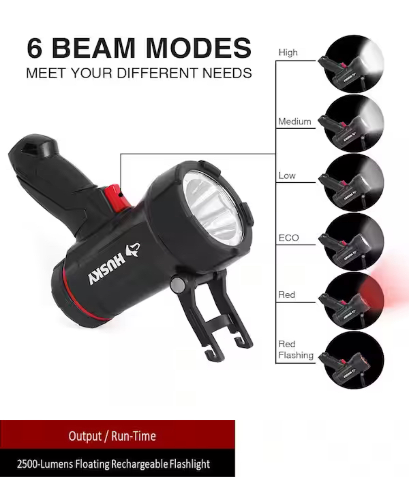 This Husky 2500-Lumens Hybrid Power Floating Rechargeable Spotlight features a compact size spotlight with super bright LED lights. High mode provides up to 2500-Lumens, 550 m throw. The 6-mode capacity provides light options for all your different projects. Modes include: high light, medium light,low light, ECO, red light, and red flashing. High, medium, and low modes provide the right amount of light for your projects, while the red helps with night vision. IPX7 waterproof and floating construction withstands the most extreme weather conditions. This spotlight will automatically flash red when in water. Features include a built-in intergrated hook and kickstand for hands-free Use. Can be powered by either Rechargeable Lithium-Ion Rechargeable Battery or (4) AA Batteries in case of emergency (4 AA Battery not included).